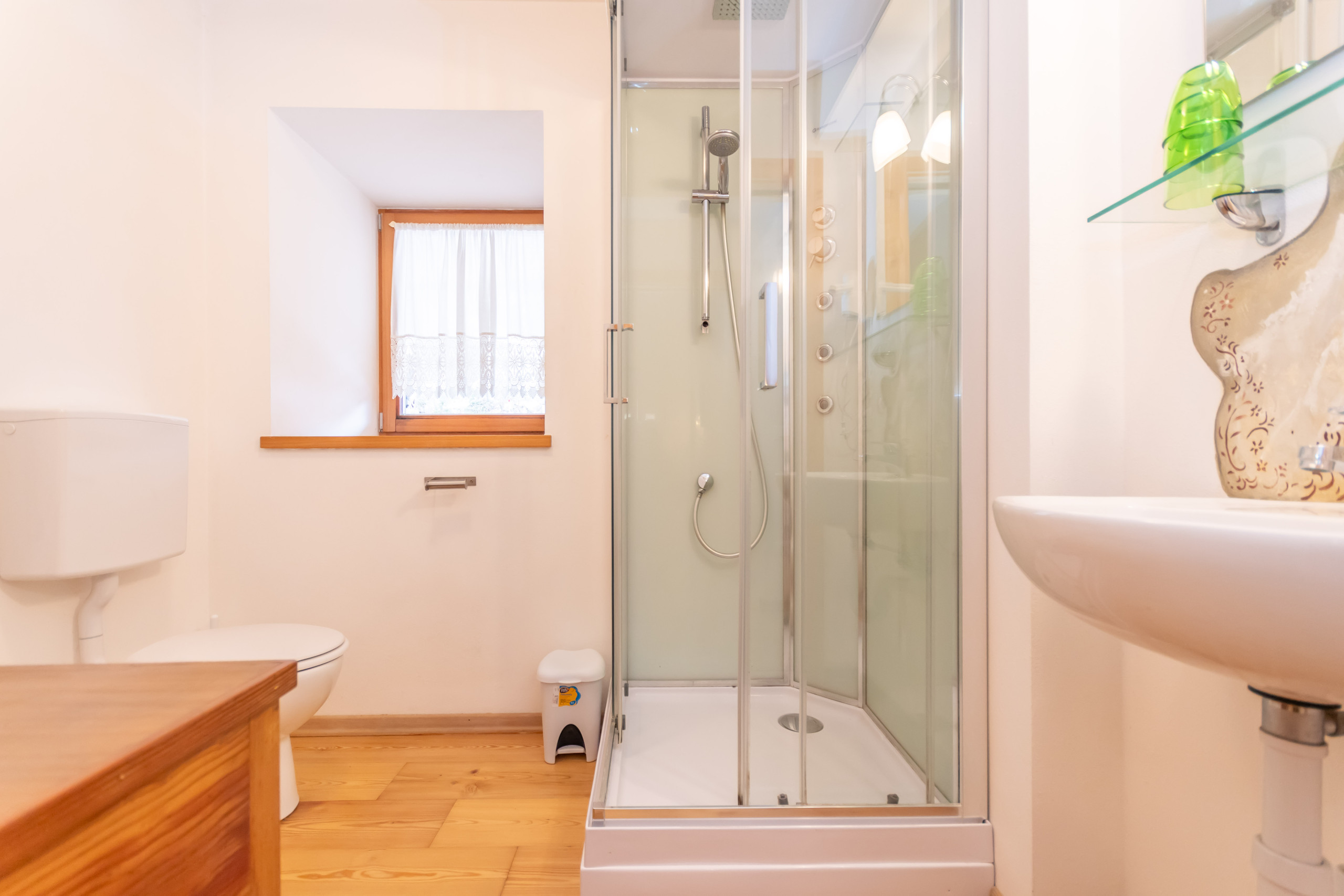 Il bagno è molto spazioso ed ha doccia, wc, bidet e lavatrice: tutto il necessario per quando si torna infangati da una gita in mountain bike o dopo un pomeriggio al parco con i più piccoli.