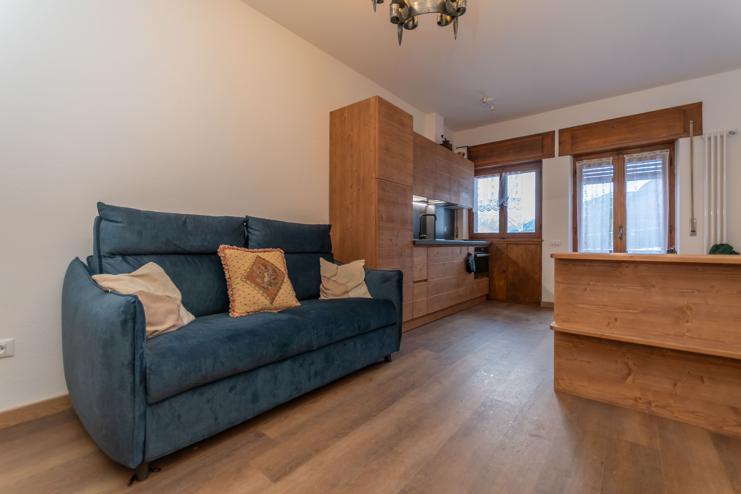 Questo appartamento si trova all'interno di un condominio chiamato RESIDENCE EDELWEISS. Si trova al primo piano ed ha una zona living con angolo cottura e divano letto ed una camera matrimoniale con all'interno anche un letto a castello, bagno con vasca.