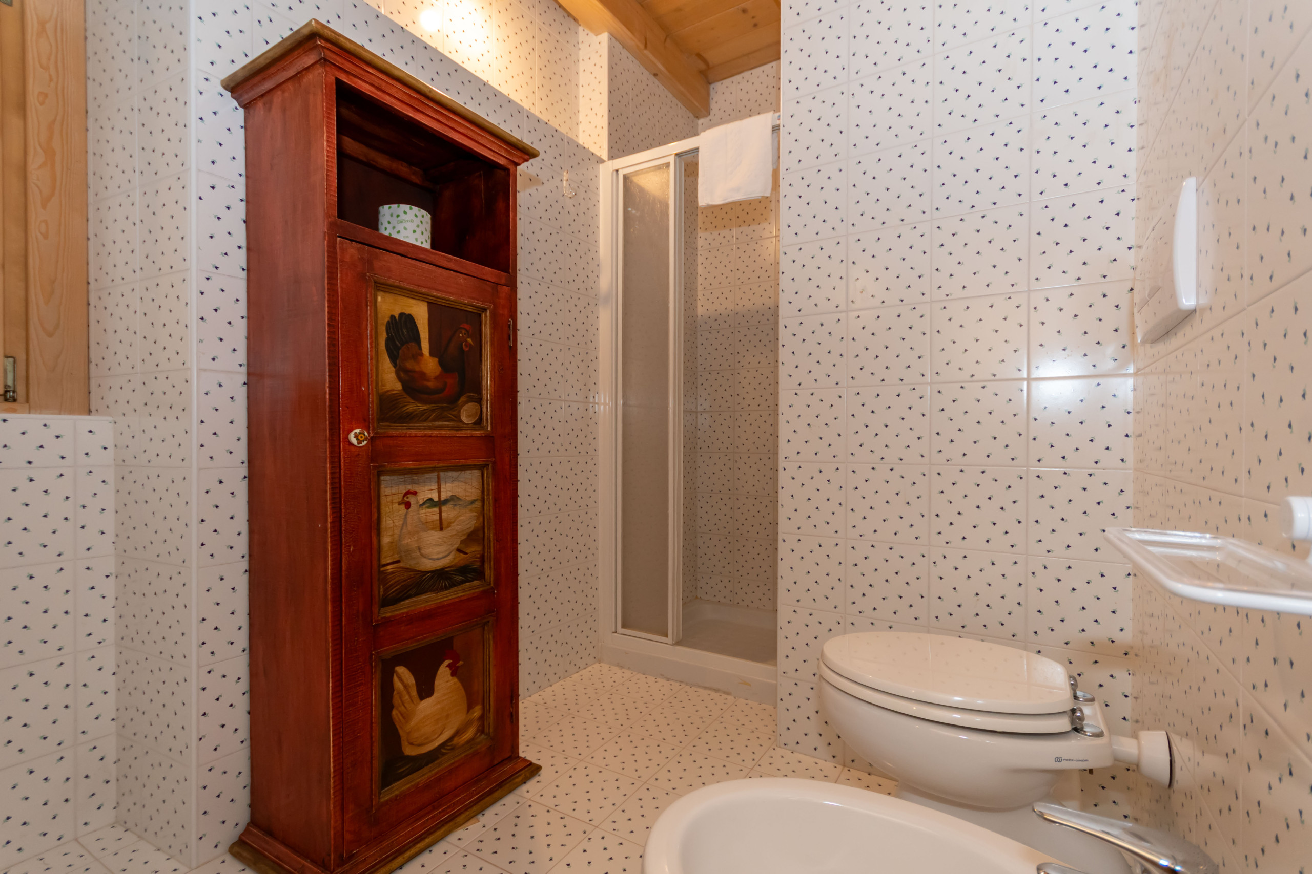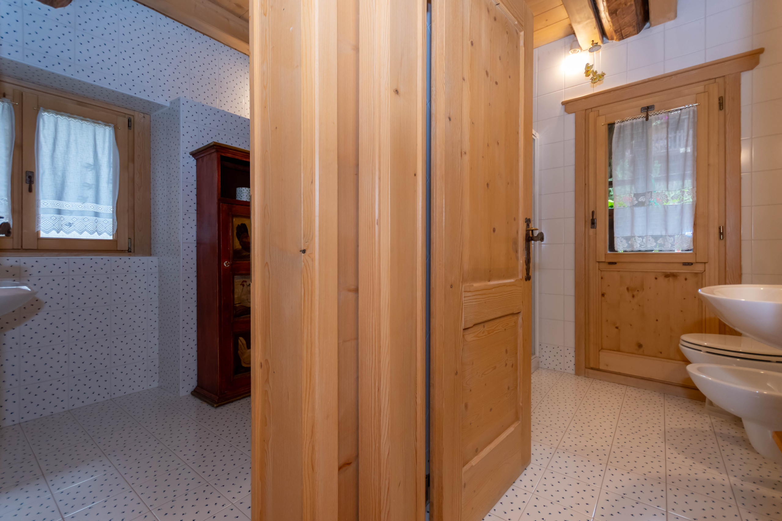 Il bagno è dotato di vasca. Dal corridoio principale si accede al grande balcone perimetrale, che offre una vista mozzafiato sul maestoso Monte Civetta.