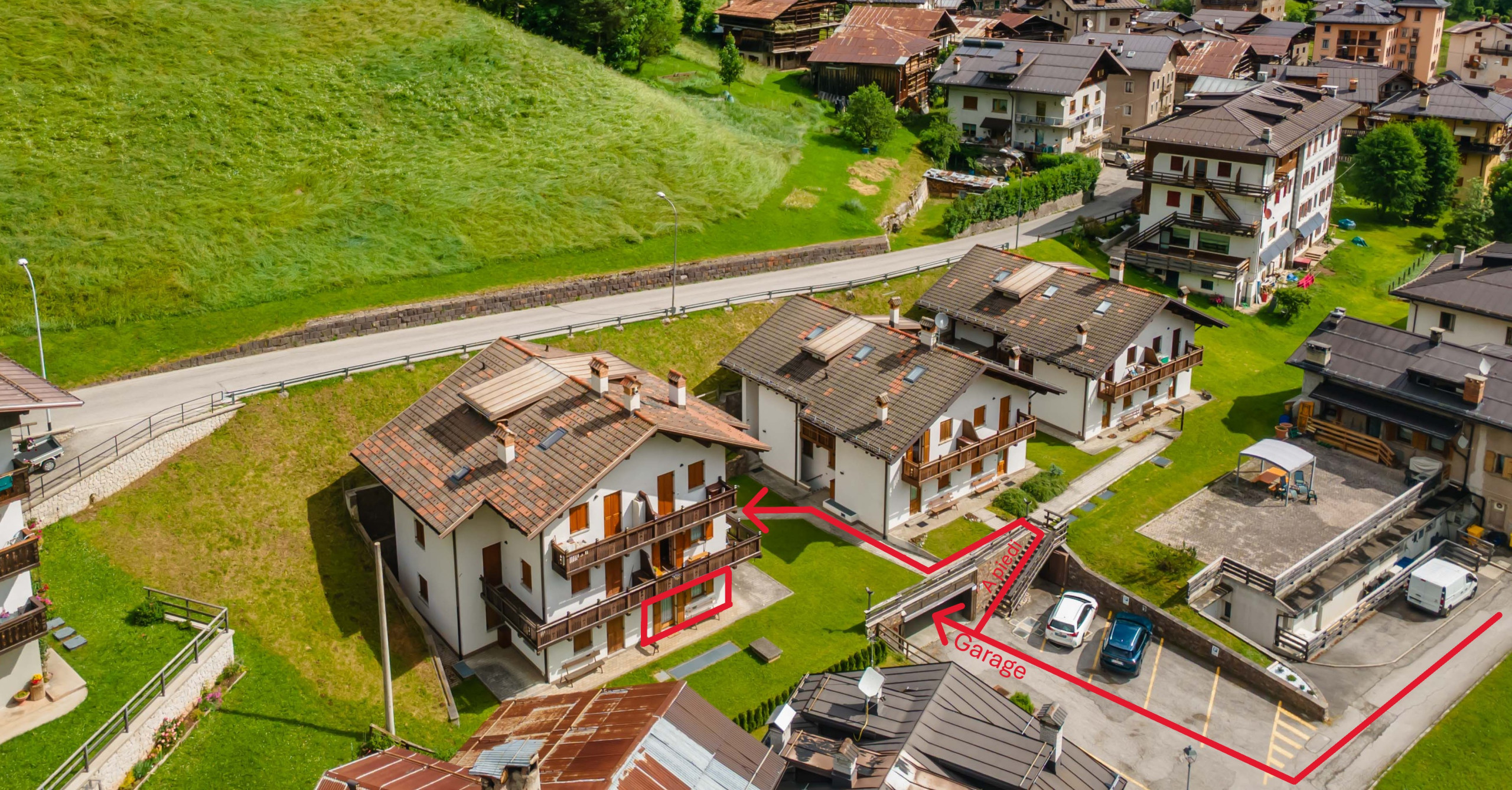 Die Wohnung befindet sich im Erdgeschoss des Gebäudes, aber um sie zu erreichen, müssen 2 Treppenabsätze vom Garagengeschoss aus überwunden werden. Sie verfügt über eine praktische private Garage zum Parken, die während des Aufenthalts maximale Bequemlichkeit gewährleistet. Der Außengarten, der direkt vom Wohnzimmer aus zugänglich ist, bietet einen entzückenden Freiraum, um sich zu entspannen und die umgebende Natur zu genießen.