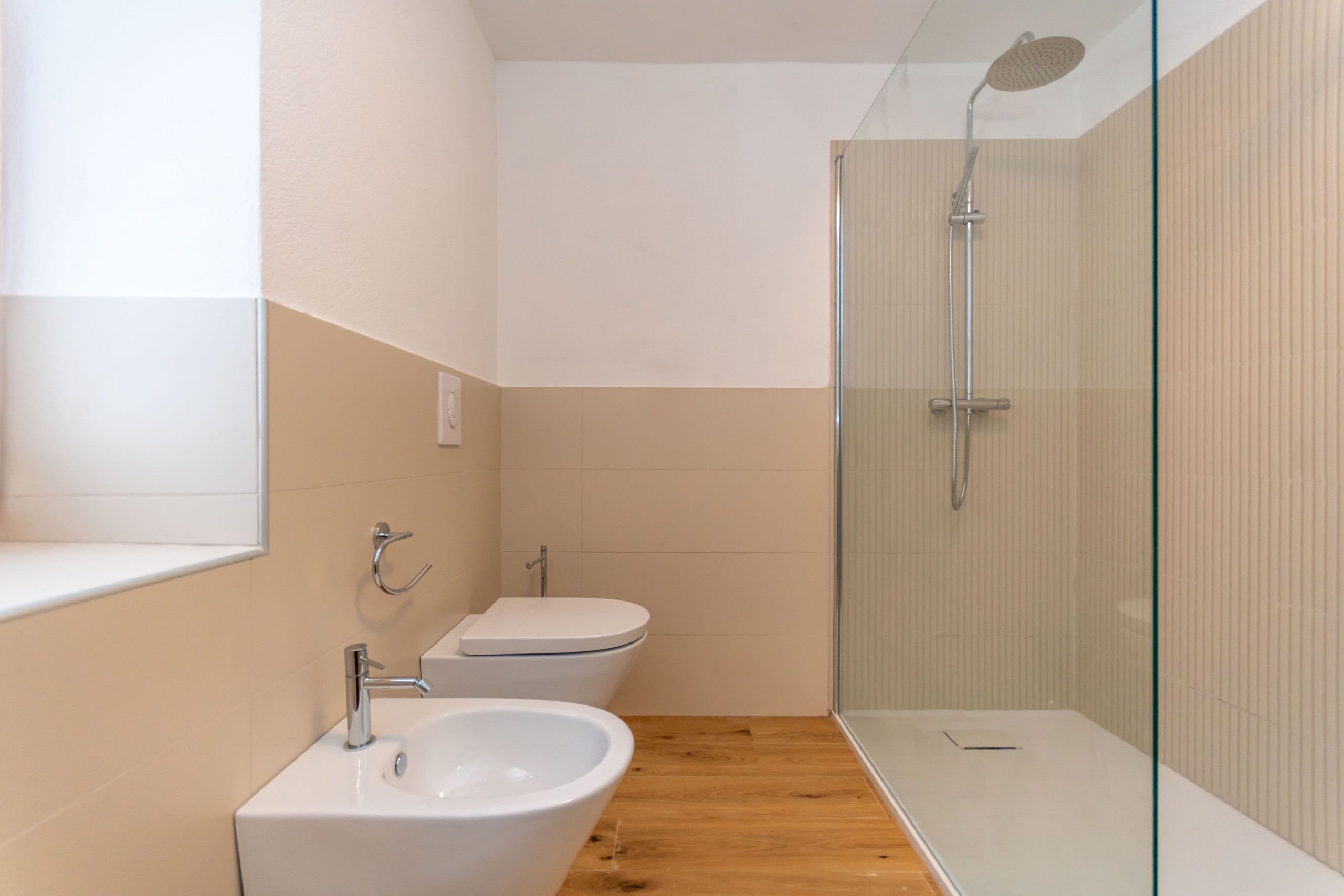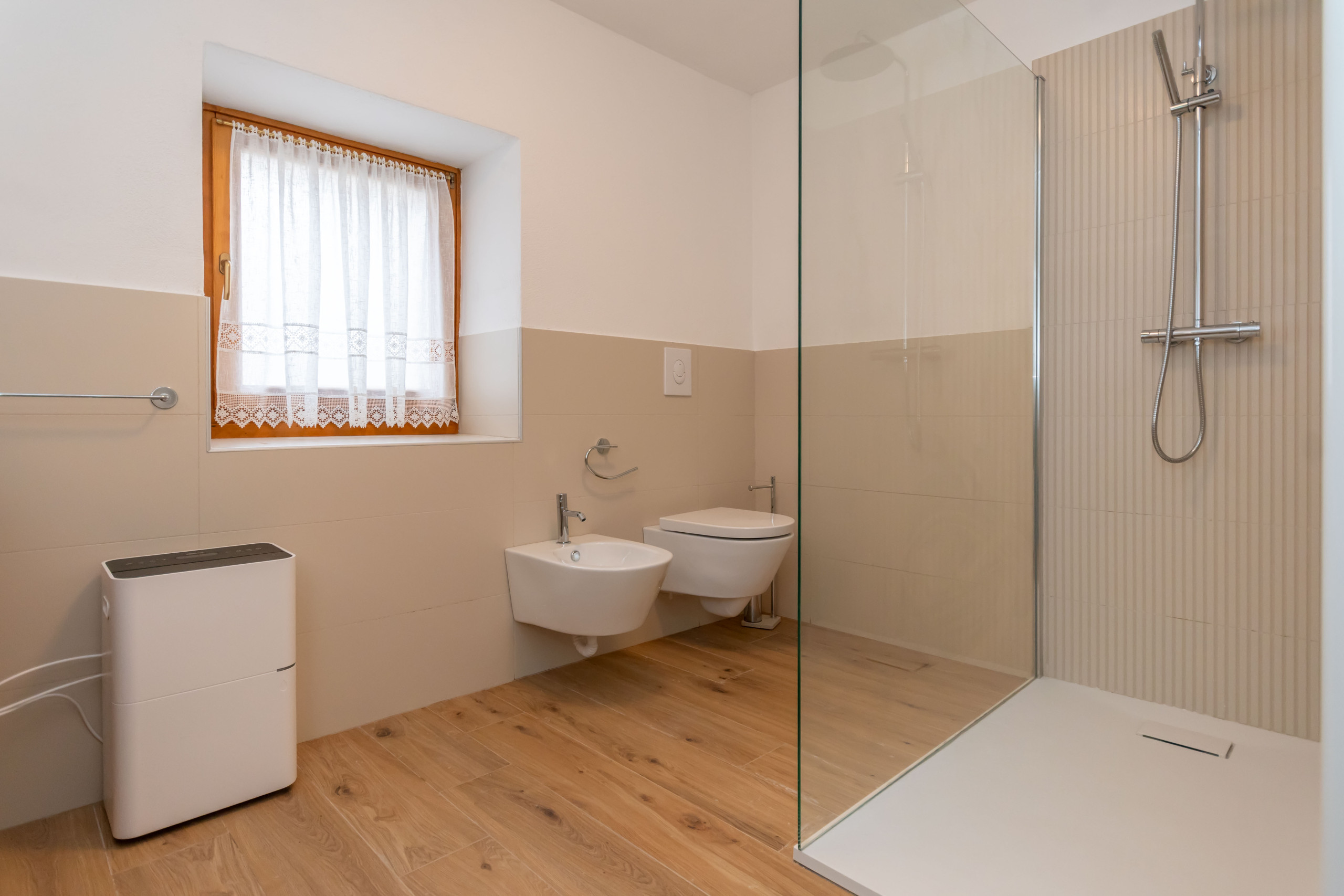 Das Badezimmer ist sehr geräumig und verfügt über eine Dusche, eine Toilette, ein Bidet und eine Waschmaschine: alles, was man braucht, wenn man von einer Mountainbiketour oder von einem Nachmittag im Park mit den Kindern schlammig zurückkommt.