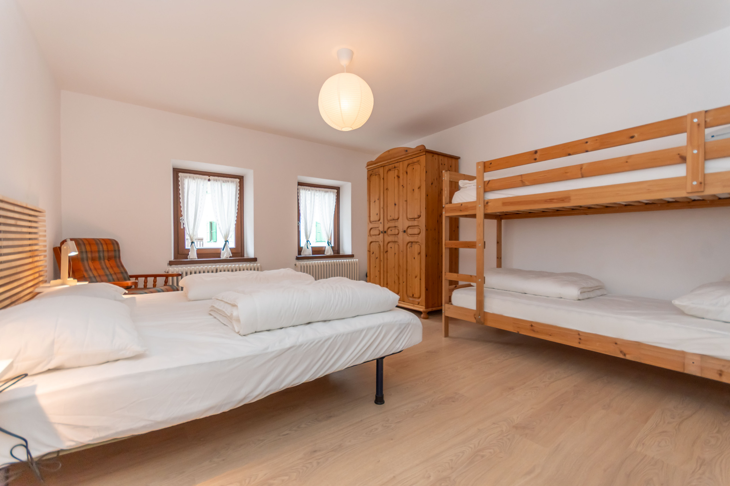 Die Wohnung befindet sich im Erdgeschoss und hat zwei Zimmer: ein Doppelzimmer für die Eltern und ein kleines Zimmer mit Etagenbett für die Kinder.