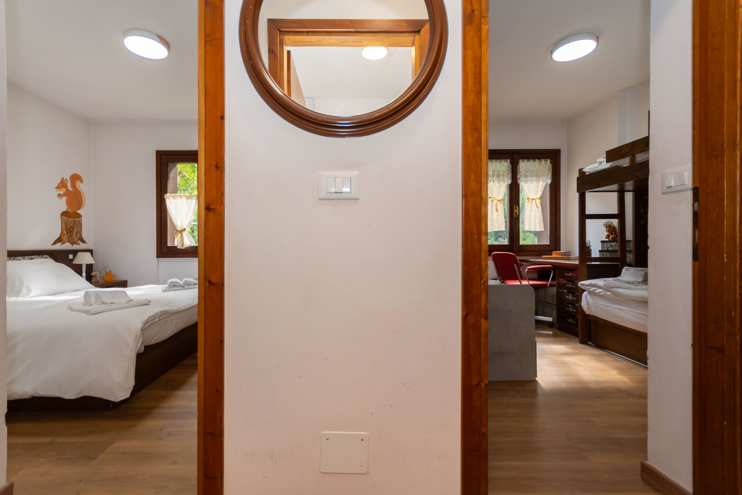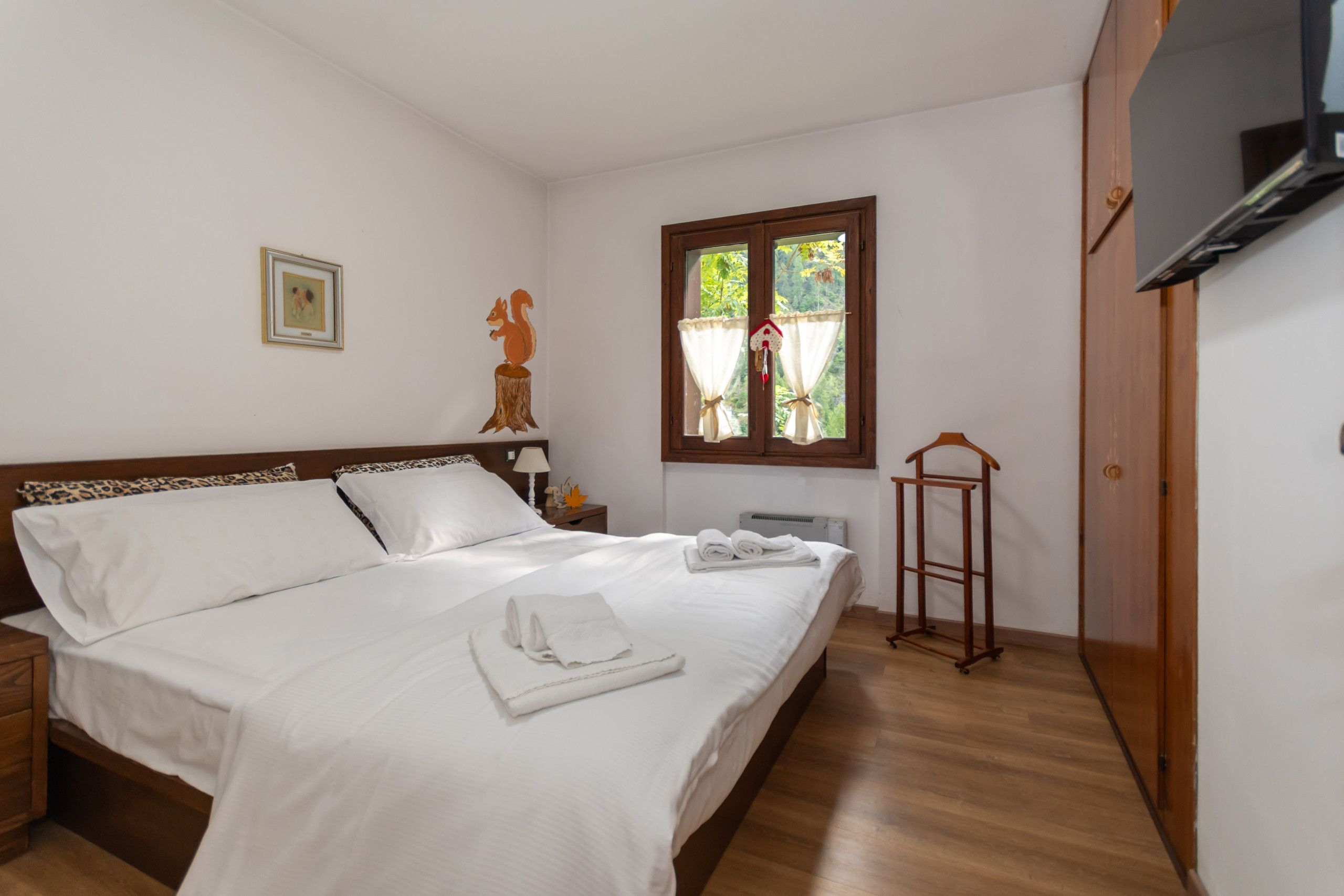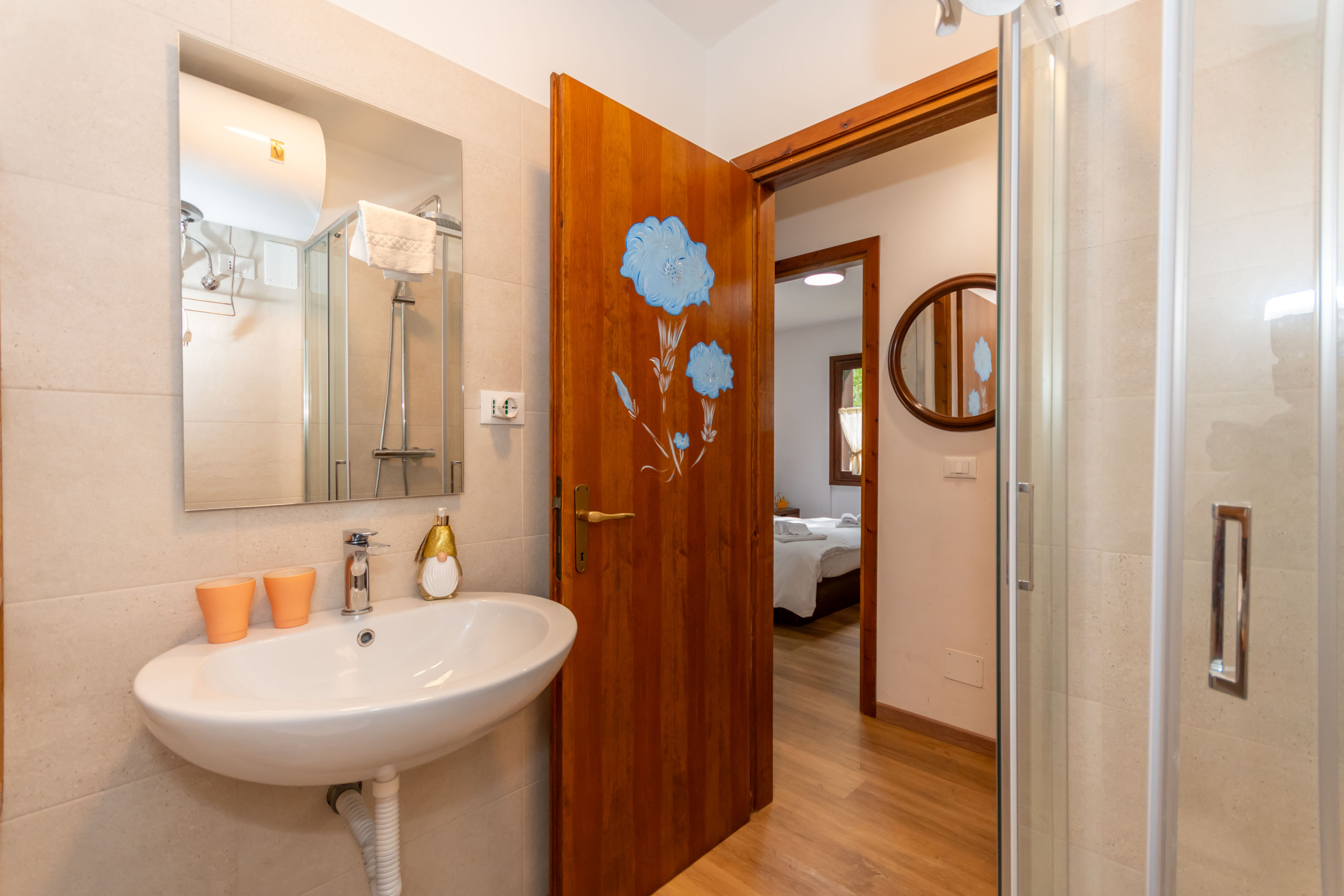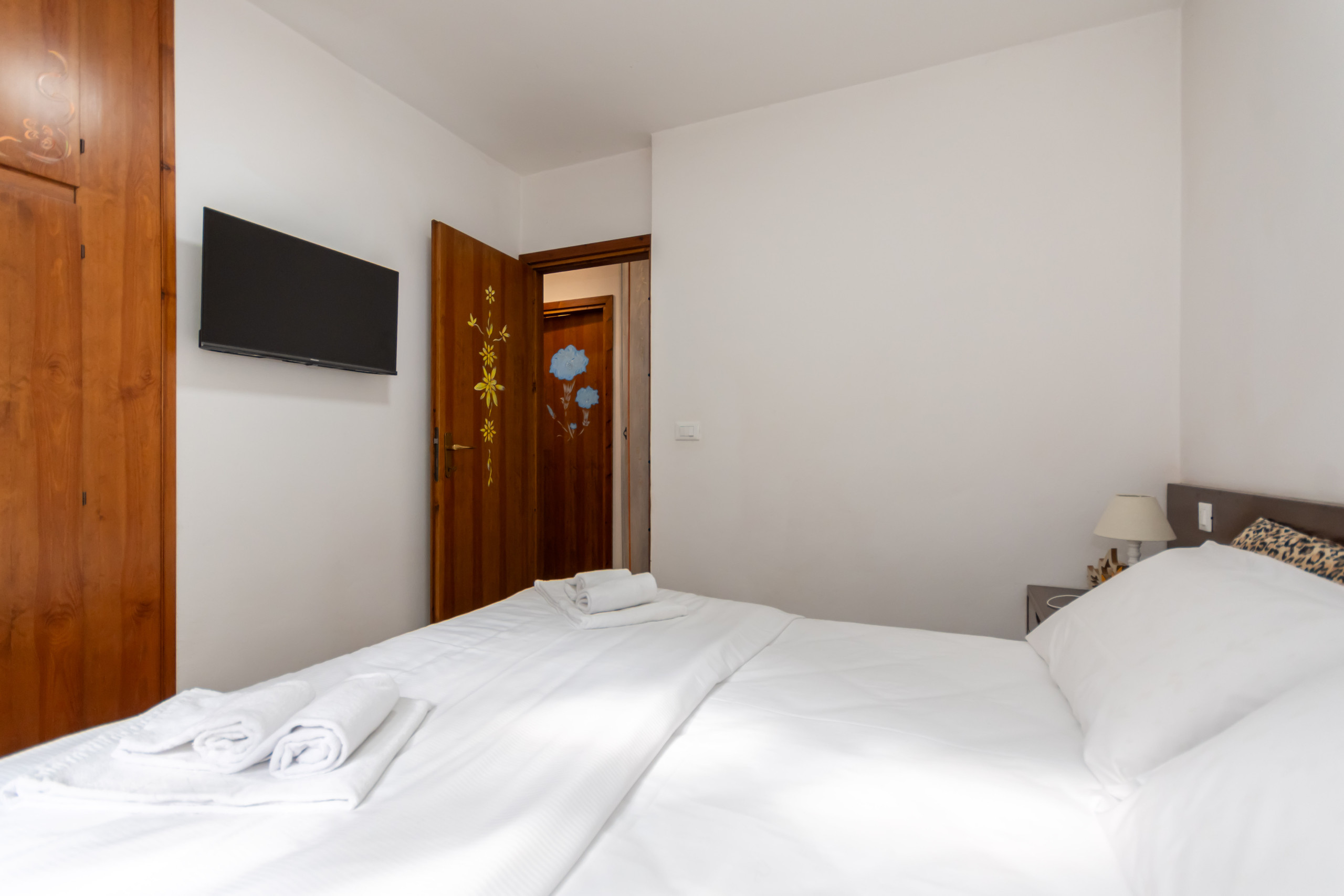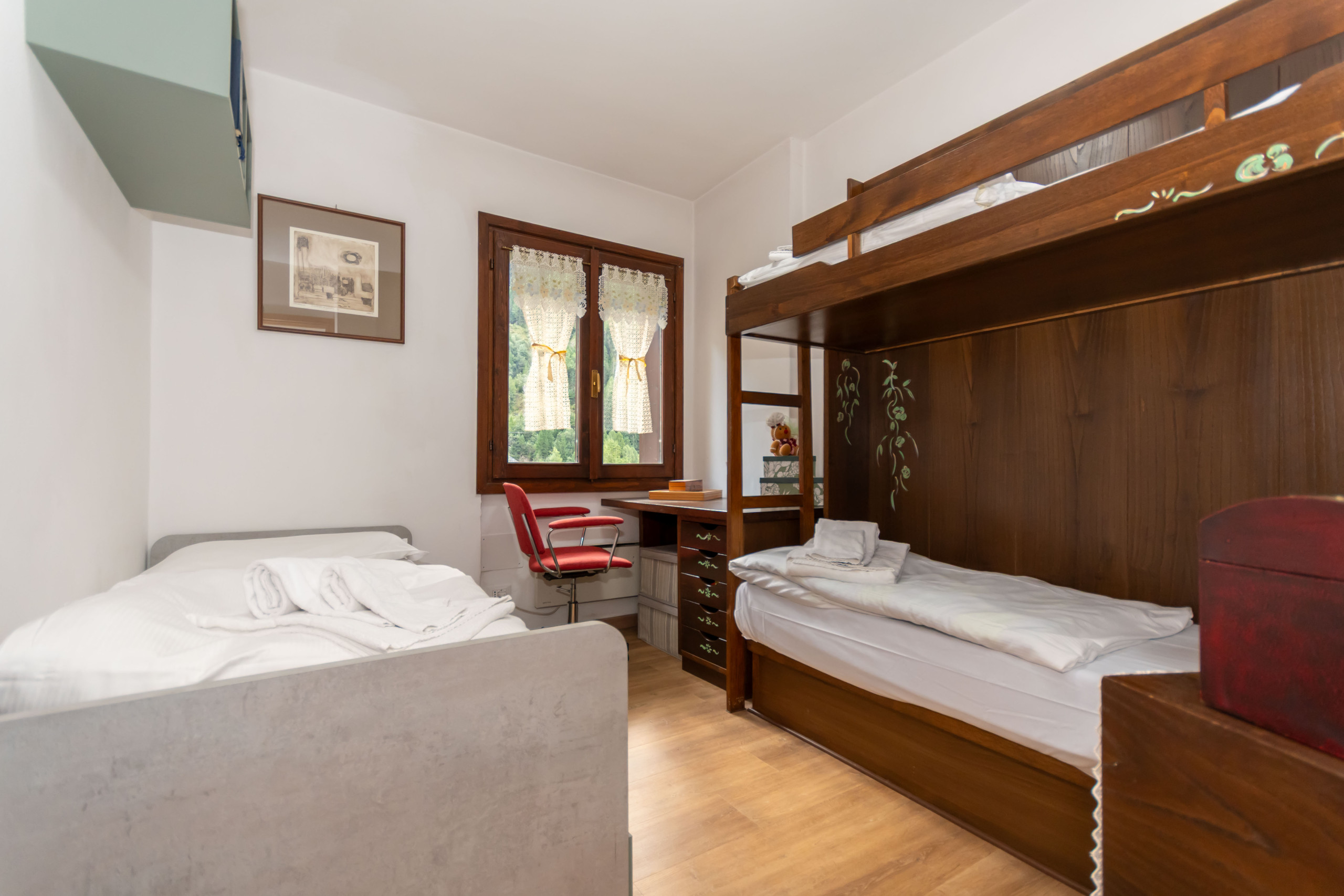 Die Wohnung verfügt über zwei Schlafzimmer: ein Doppelbett, ein Einzelbett und ein Stockbett, ideal um bequem bis zu 5 Personen zu beherbergen. Die Innenfläche von 60 m² ist geschmackvoll und funktional eingerichtet, mit einer voll ausgestatteten Küche, die Kühlschrank, Ofen, Kaffeemaschine und alle notwendigen Utensilien zum Zubereiten köstlicher Mahlzeiten umfasst.
