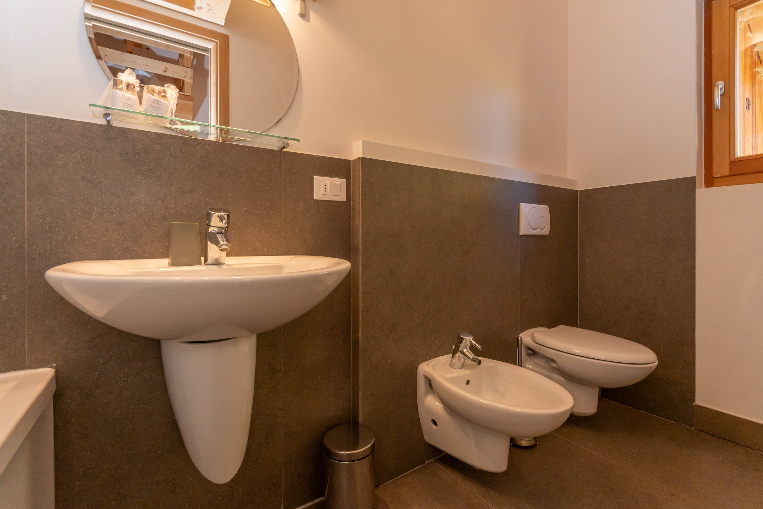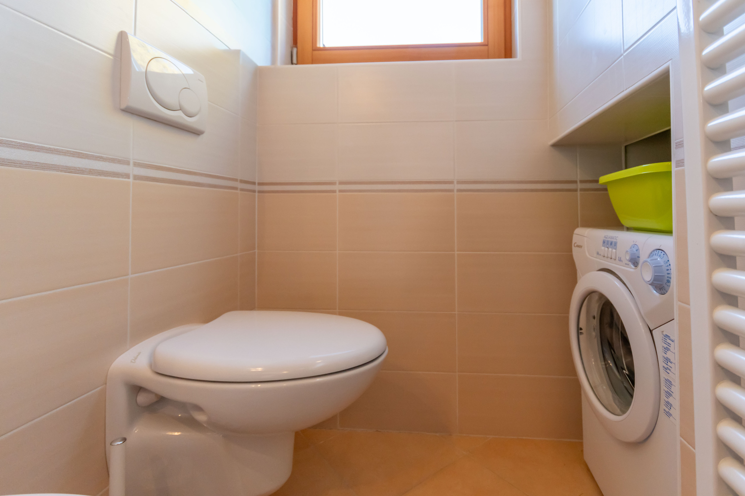 Das Badezimmer ist sehr geräumig und verfügt über eine Dusche, eine Toilette, ein Bidet und eine Waschmaschine: alles, was man braucht, wenn man von einer Mountainbiketour oder von einem Nachmittag im Park mit den Kindern schlammig zurückkommt.