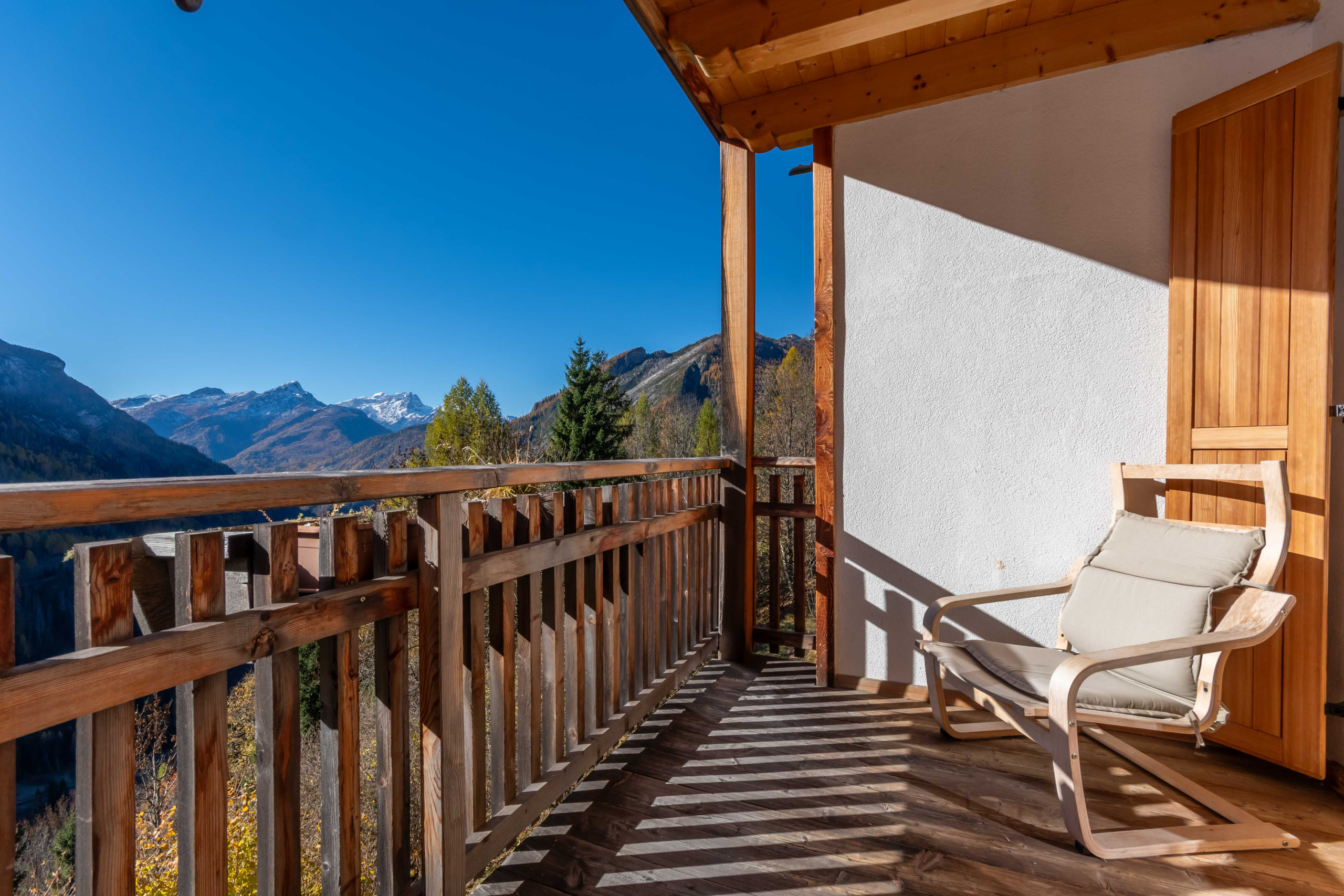 Außerhalb der Wohnung befindet sich ein privater Balkon, der einen herrlichen Blick auf die umliegenden Berge bietet – ideal, um entspannte Momente zu genießen.
