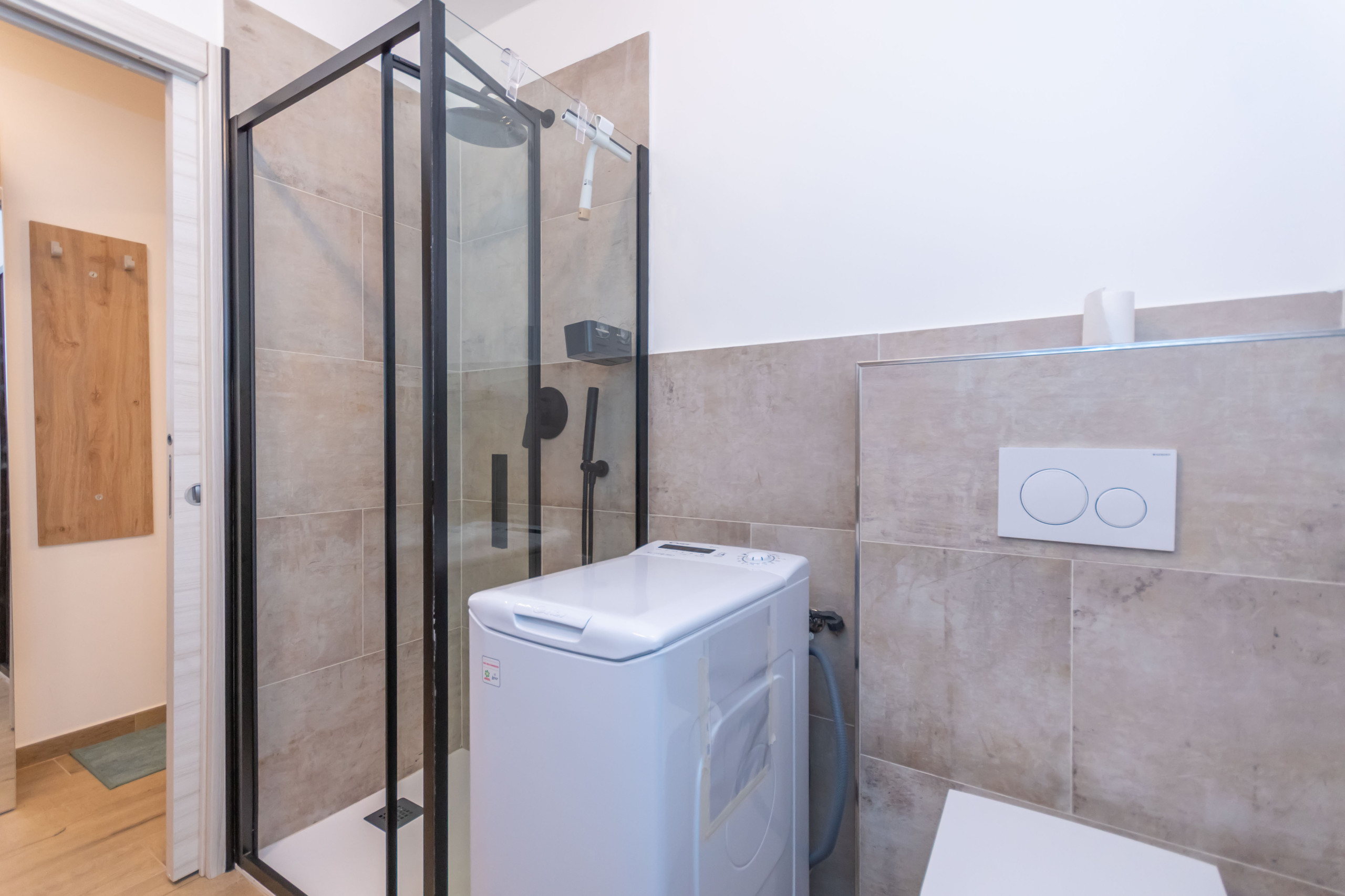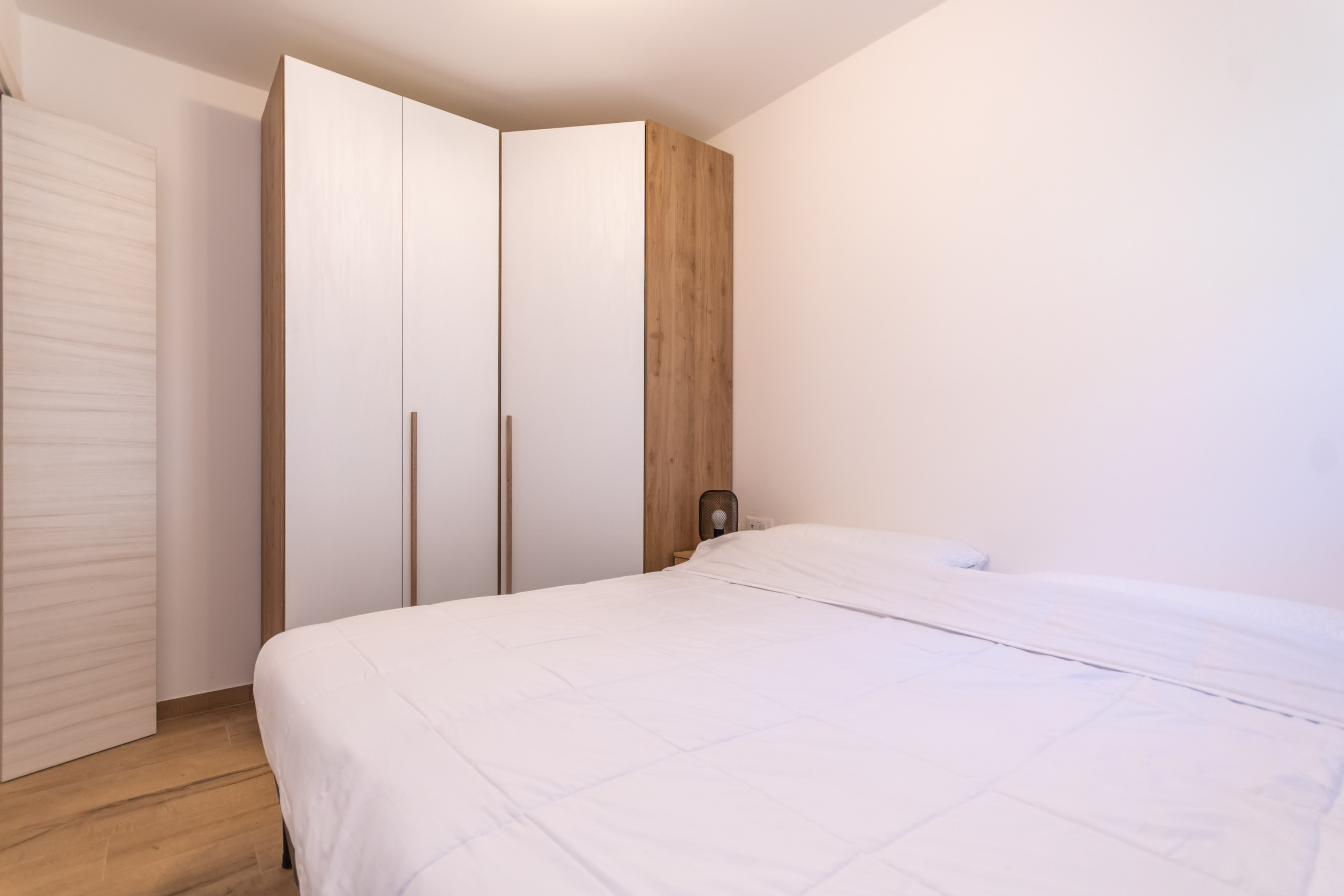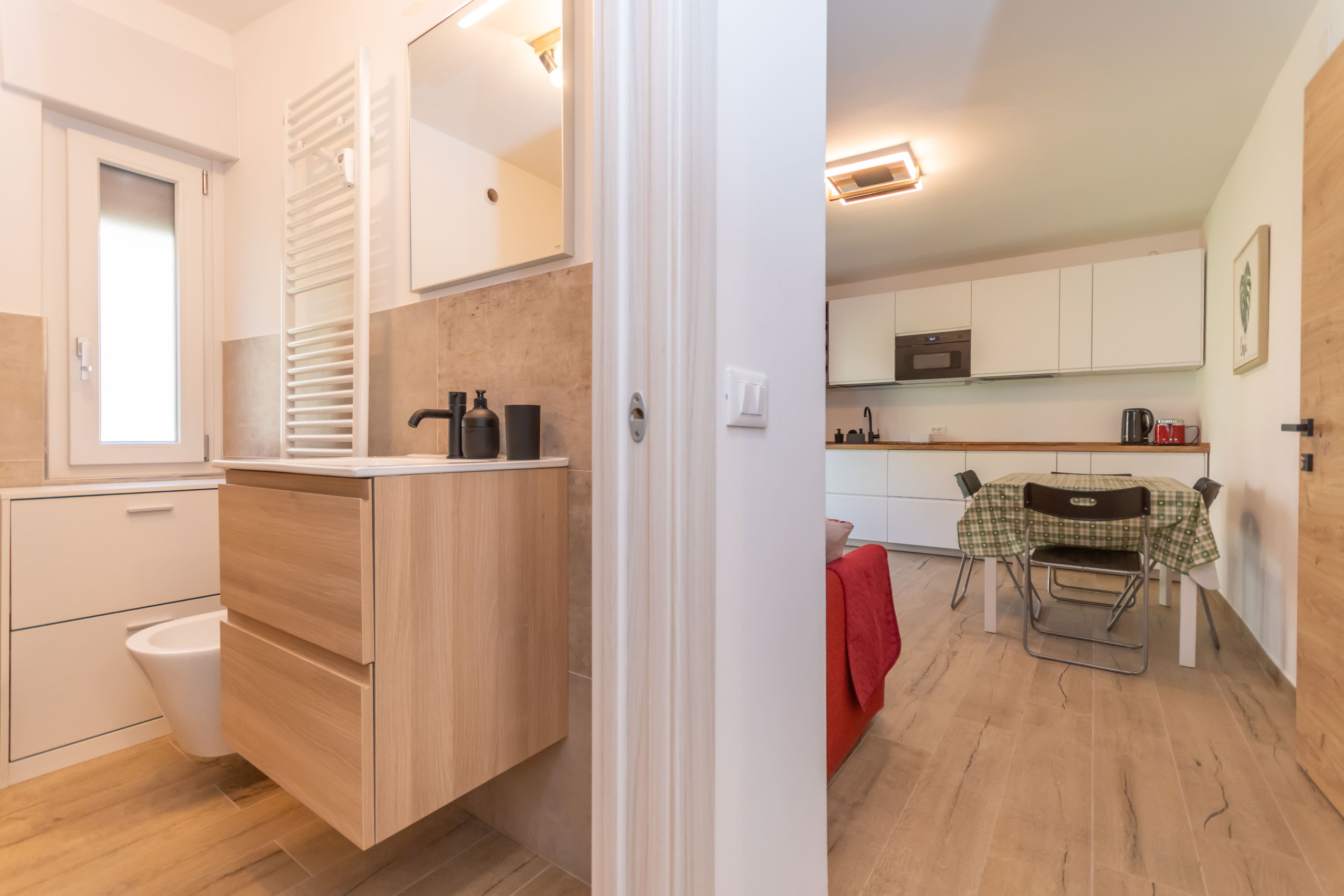 Die kleine Wohnung hat einen Eingang im Erdgeschoss, befindet sich aber im Untergeschoss, mit einer kleinen Küchenzeile, einem Wohnbereich mit Zugang zum Panoramabalkon, einem kleinen Kühlschrank plus einem zusätzlichen großen Kühlschrank, einer neuen Waschmaschine, einem Zimmer mit Einzelbetten und einer kleinen Kammer mit Etagenbett, ideal für zwei kleine Kinder und weniger für Erwachsene, sowie einem kleinen Bad mit Dusche.