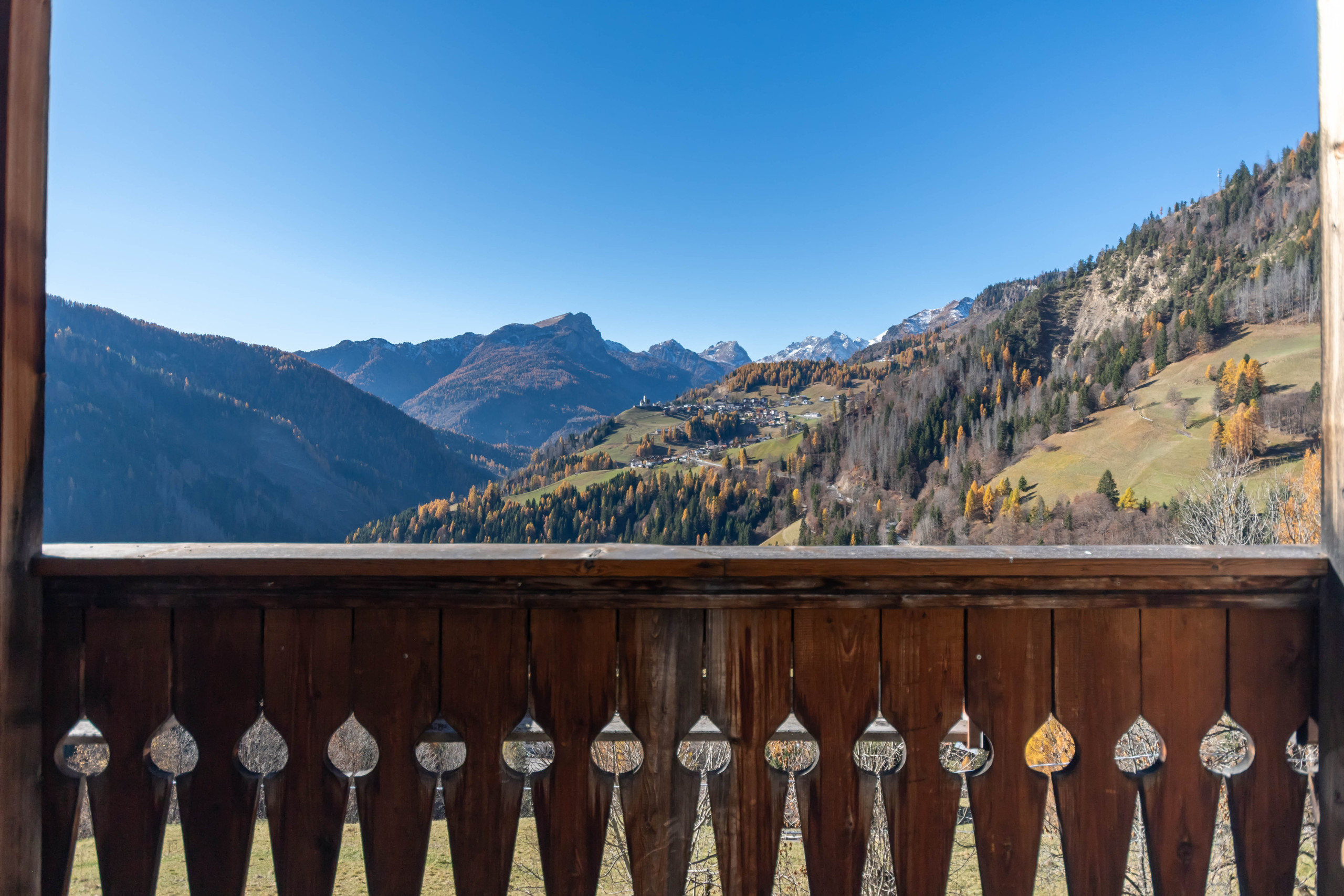 Die Wohnung verfügt über eine ruhige und aussichtsreiche Lage mit einem herrlichen Blick auf die umliegenden Berge. Der Balkon im Freien ist ein Highlight und ermöglicht es, atemberaubende Landschaften zu genießen und die frische Luft der Dolomiten zu atmen. Die Außenterrasse bietet zudem einen idealen Raum zum Entspannen nach einem Tag voller Wanderungen oder Skifahren.