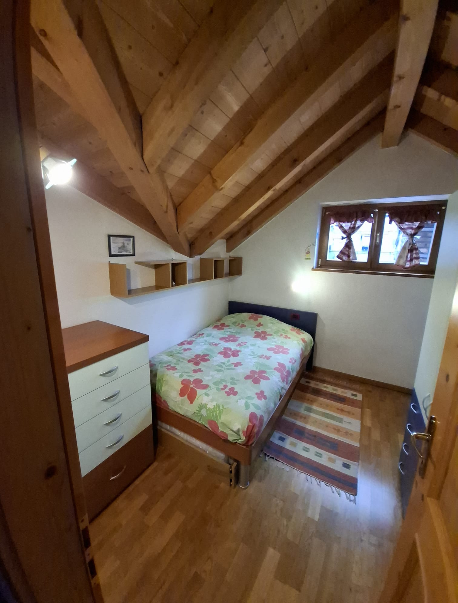 Im zweiten Stock gelegen, vereint diese Unterkunft modernen Komfort und authentischen Alpinstil, dank der sichtbaren Balken und des Parkettbodens, die eine warme und einladende Atmosphäre schaffen.