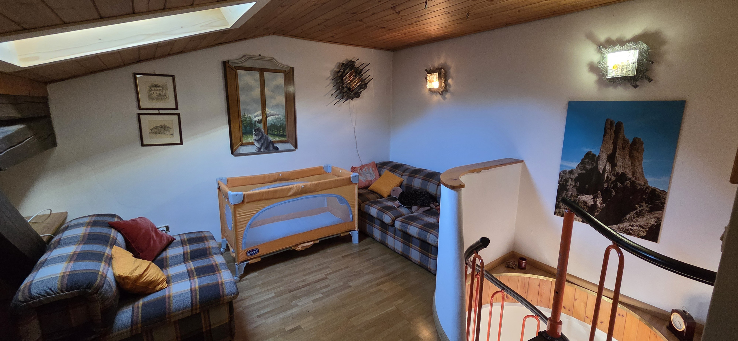 House chases... thoughts is the ideal solution for your family or for you and your friends: in Pera di Fassa, not far from the ski lifts of Pera and Pozza di Fassa, two-level apartment, with double bedroom, room with bunk bed, bathroom with bathtub and washing machine, new kitchen with dishwasher, on the upper floor double room, second bathroom with shower, relaxation area with presence of cot for newborns.