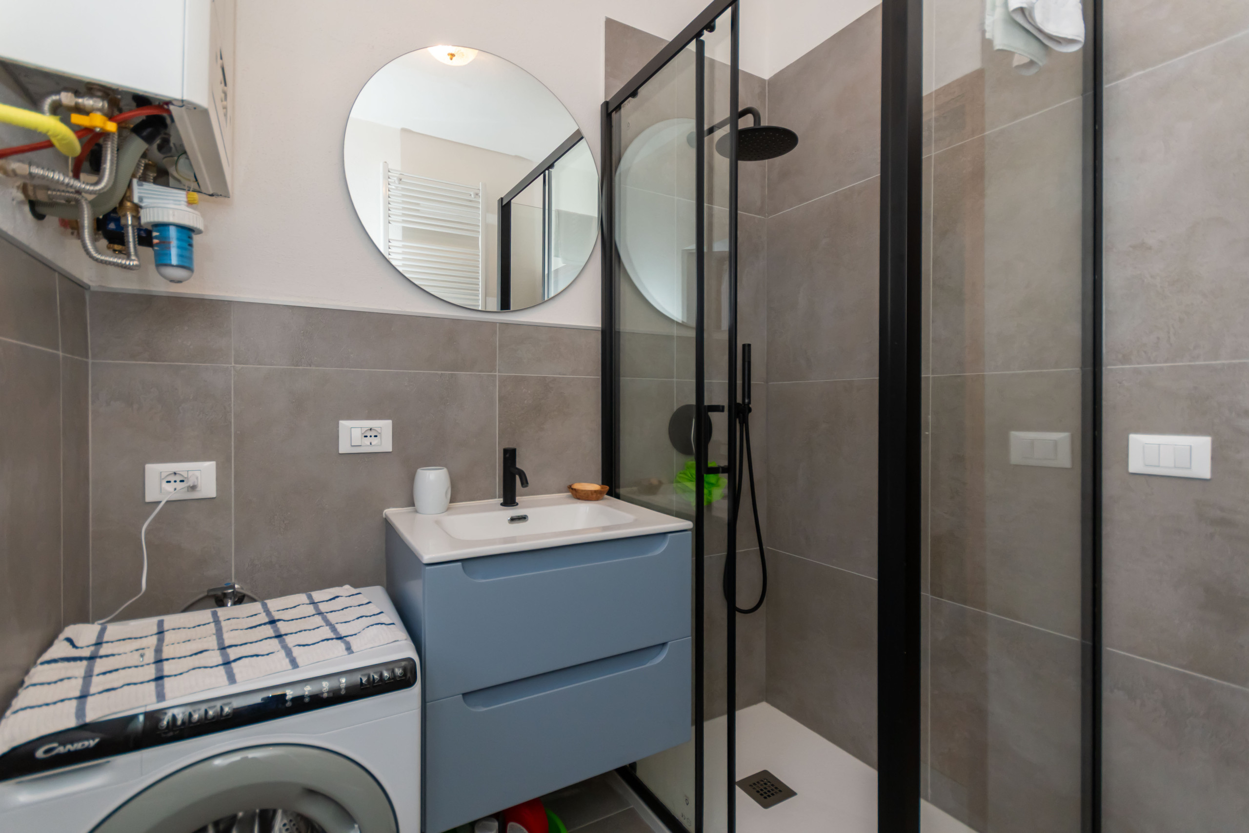 The apartment has two bedrooms with three different types of beds: a bunk bed, a double bed, and a sofa bed, ensuring flexibility and comfort for all guests. A bathroom with a complete shower completes the interior layout, while the kitchen is fully equipped with modern appliances such as a refrigerator, washing machine, oven, coffee machine, and dishwasher.