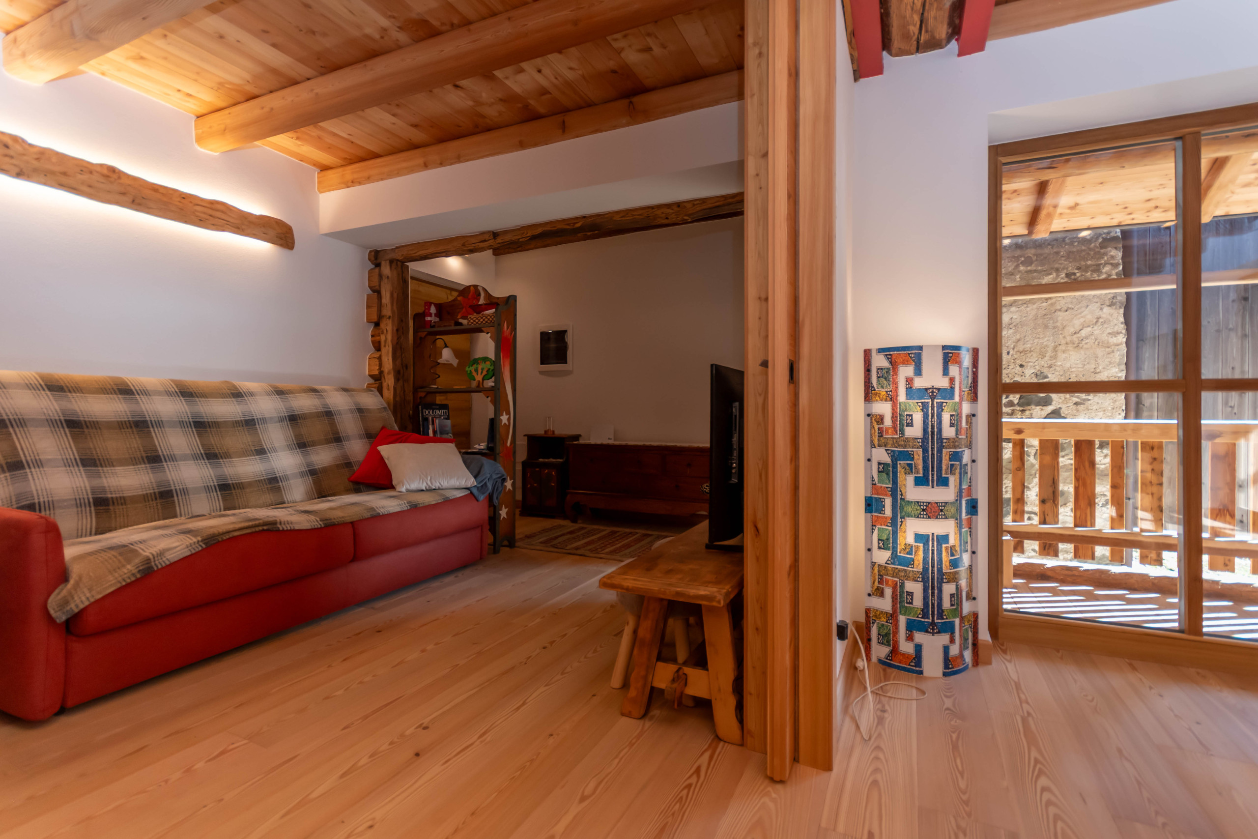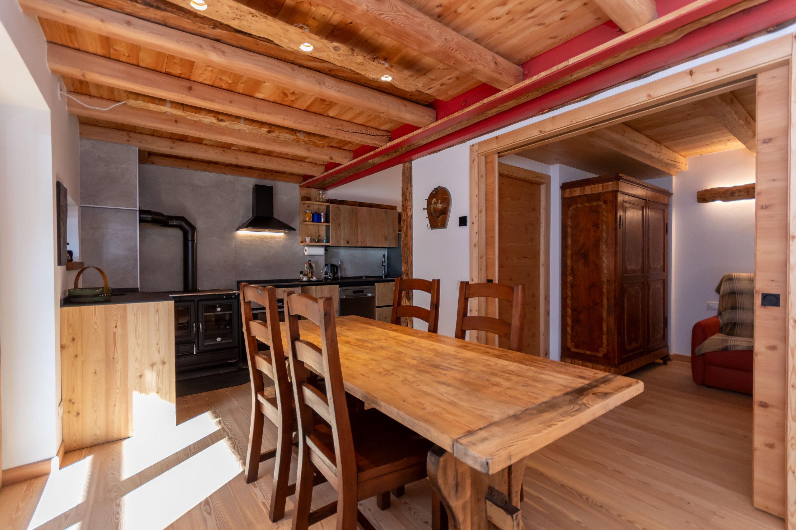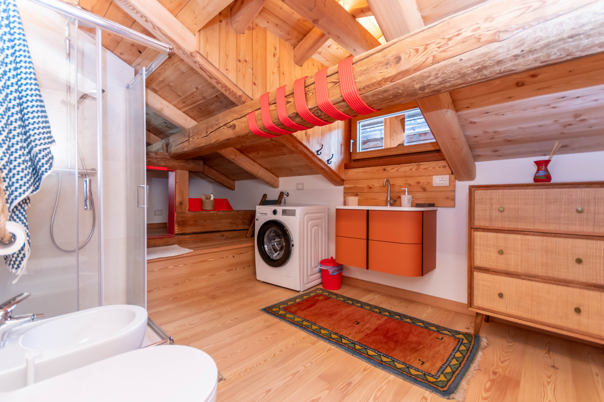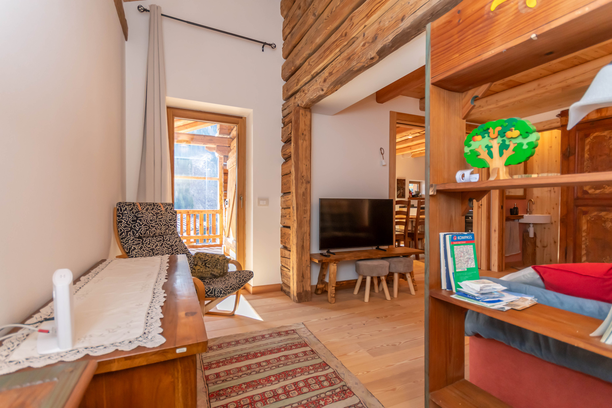 Obtained from the wise renovation of an ancient Tabià, the apartment is developed on two floors for a total of 75 sqm, creating an intimate and well-organized atmosphere. On the first floor, a main double bedroom with an additional single bed and a complete bathroom with shower. On the ground floor, the fully equipped kitchen and the living room with a comfortable double sofa bed. During the night, thanks to the sliding door, it is possible to transform the living room into a real bedroom, ensuring privacy for all guests. A small bathroom with toilet and sink completes the layout. The accommodation is ideal for hosting up to 5 people, offering comfort and functionality.