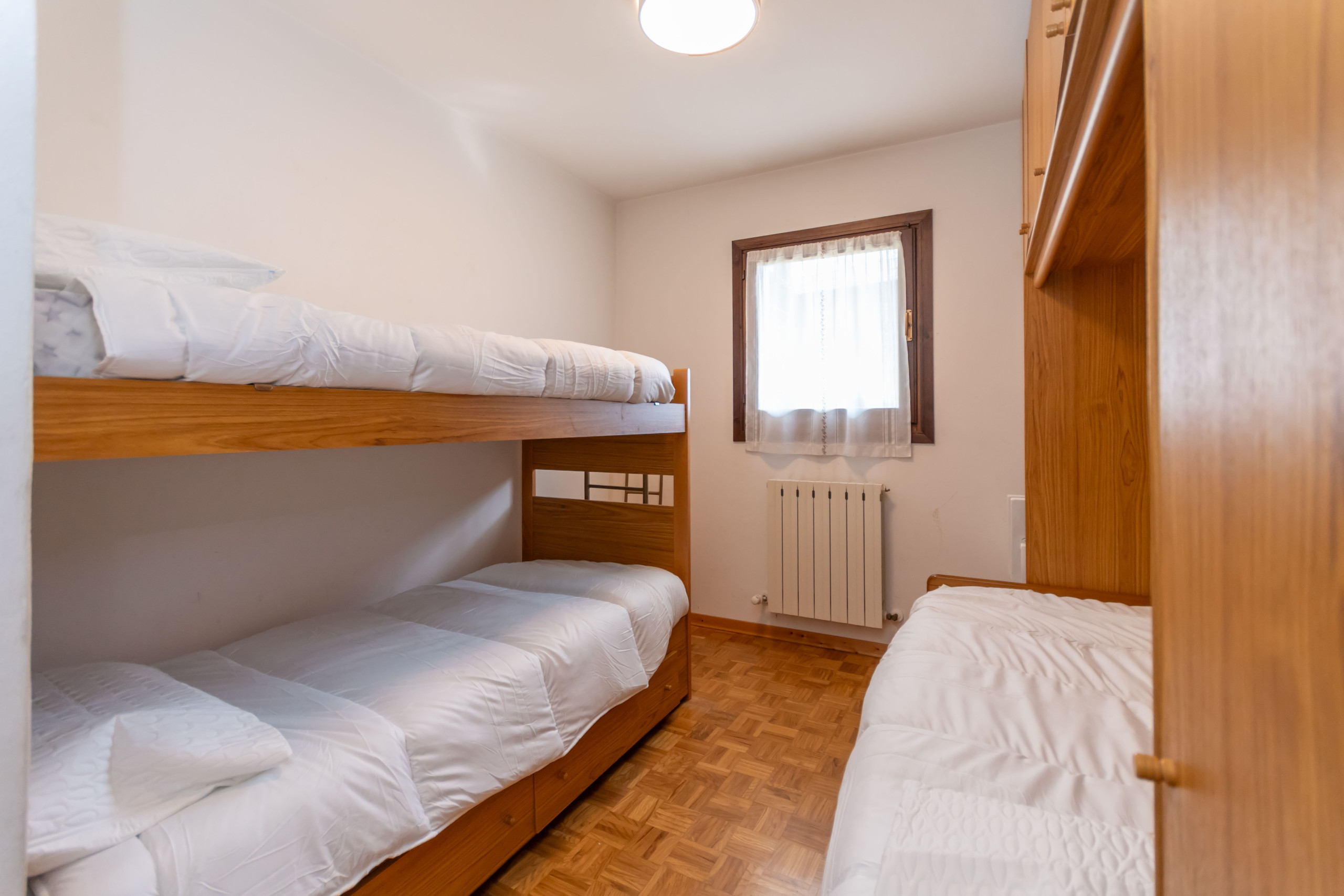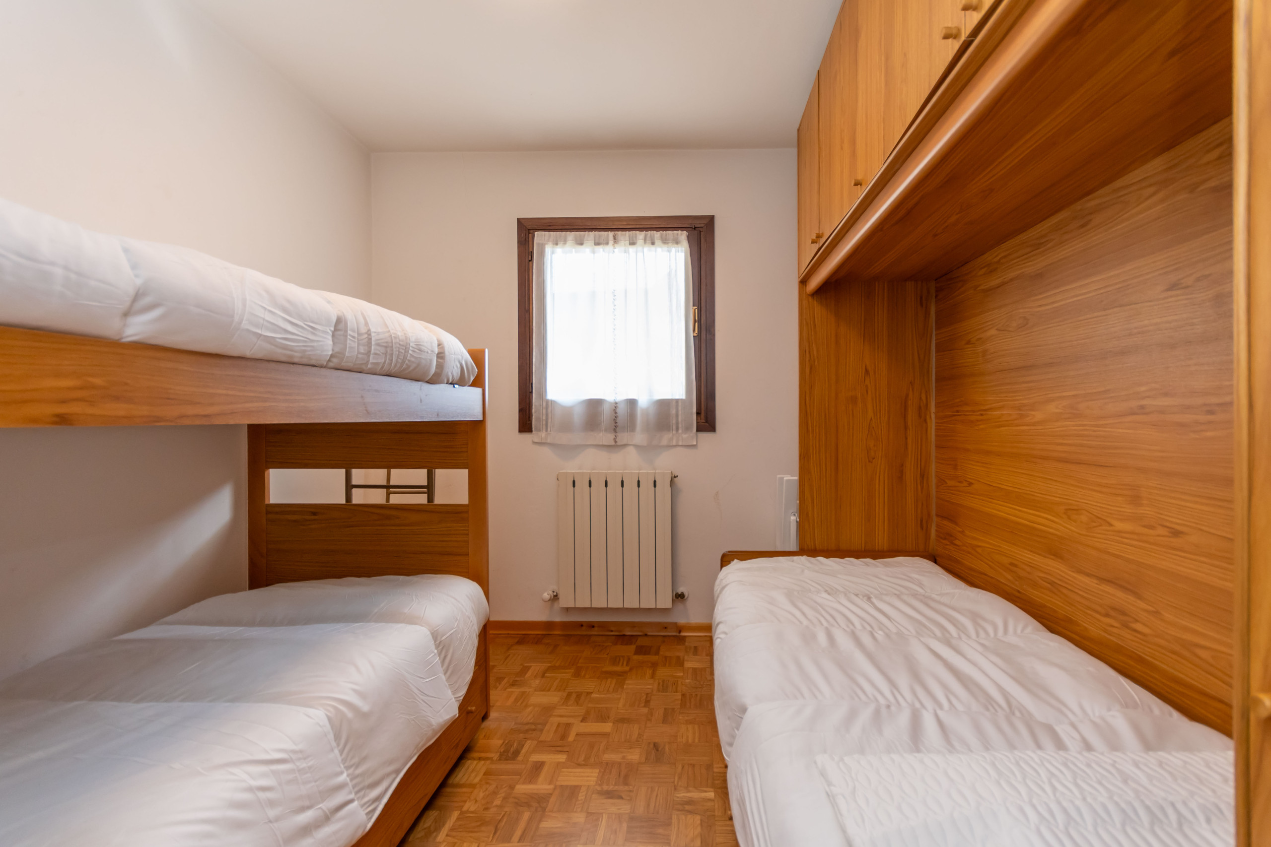 The internal staircase takes us to the first floor where there is the second bathroom, bedroom with a bunk bed, a bedroom with a double bed and the large master bedroom with access to the 24 sqm terrace, Pelmo view, Ideal for relaxing moments outdoors and in comfort.